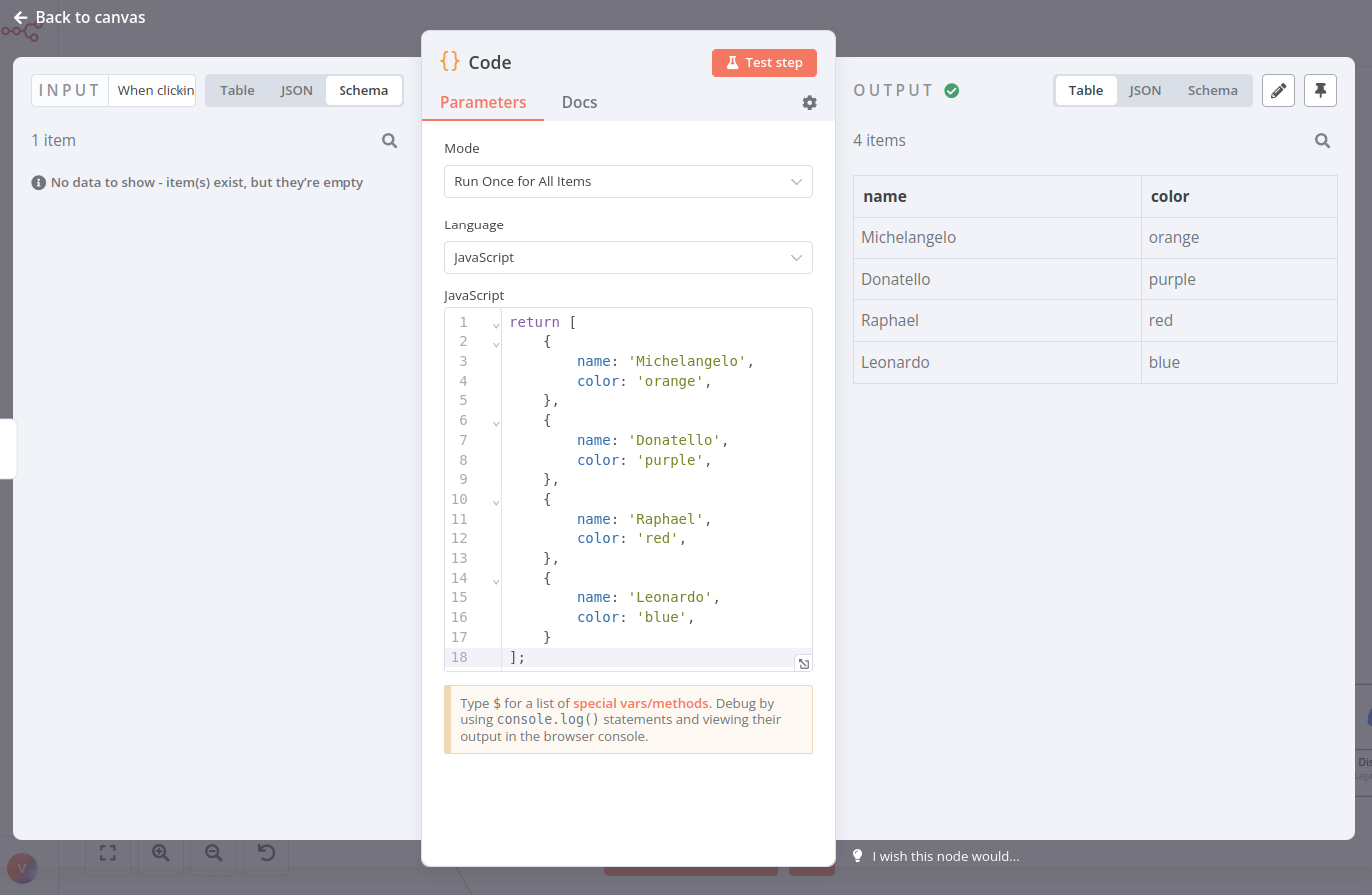 For example, the array of objects representing the Ninja turtles would look like this in the Code node: