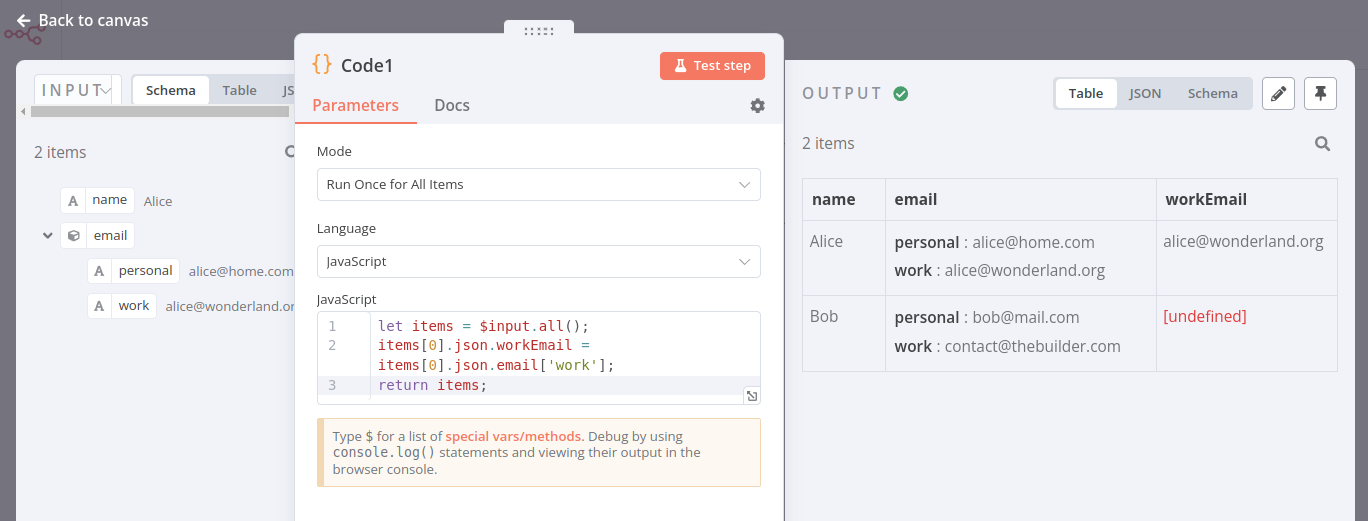 Let's build on the previous exercise, in which you used the Code node to create a data set of two contacts with their names and emails. Now, connect a second Code node to the first one. In the new node, write code to create a new column named workEmail that references the work email of the first contact.